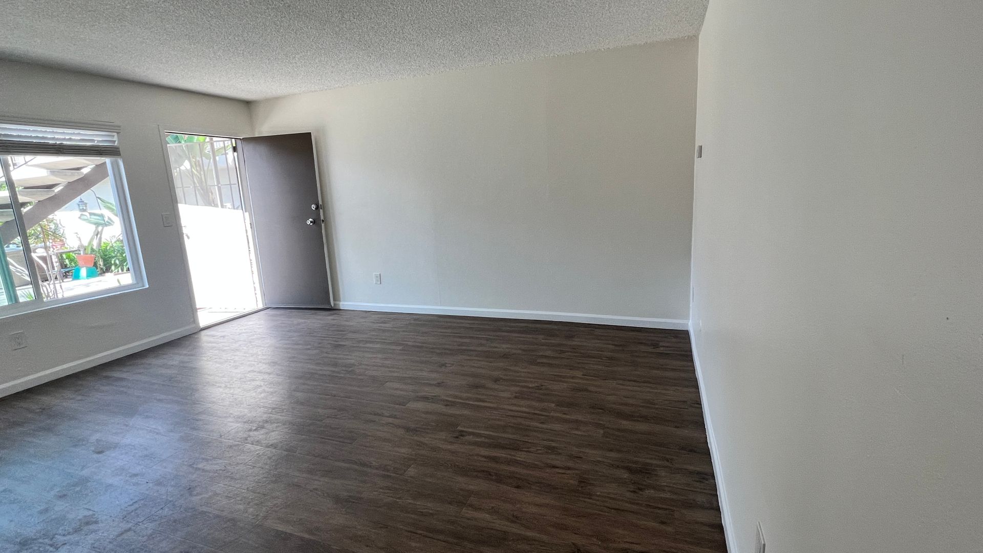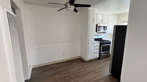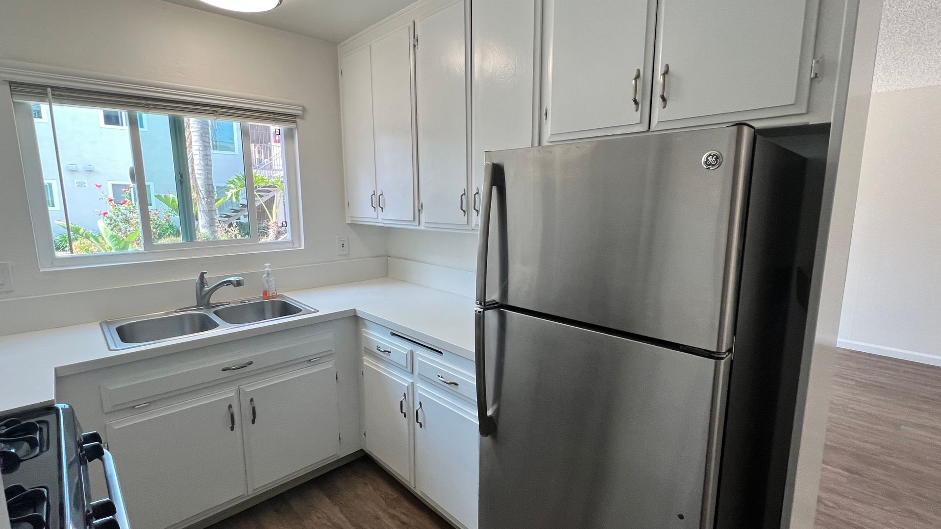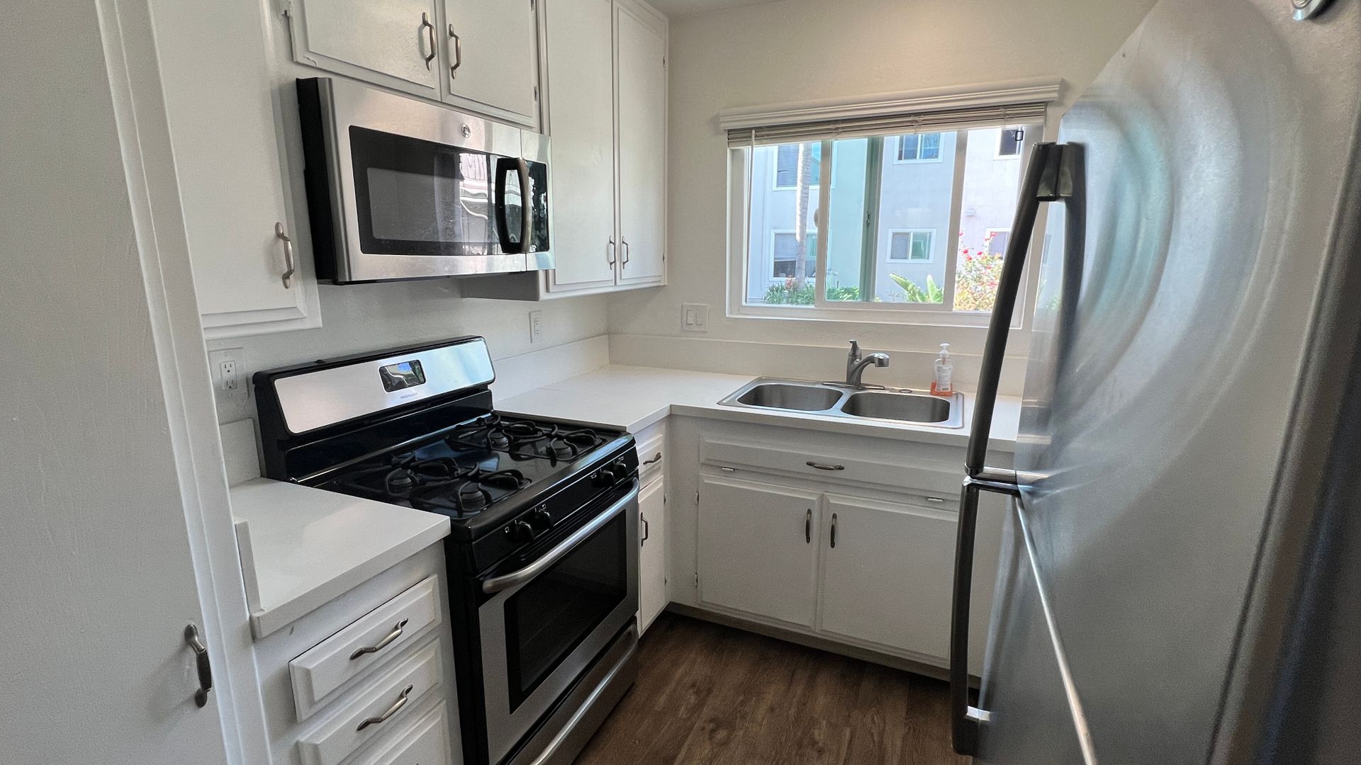 Large 1 bedroom unit on the ground floor in North Park featuring wood-like solid floors in living room, kitchen, dining area, and bath. The kitchen features stainless-steel appliances including a built-in microwave and gas stove, plus lots of cabinet space.