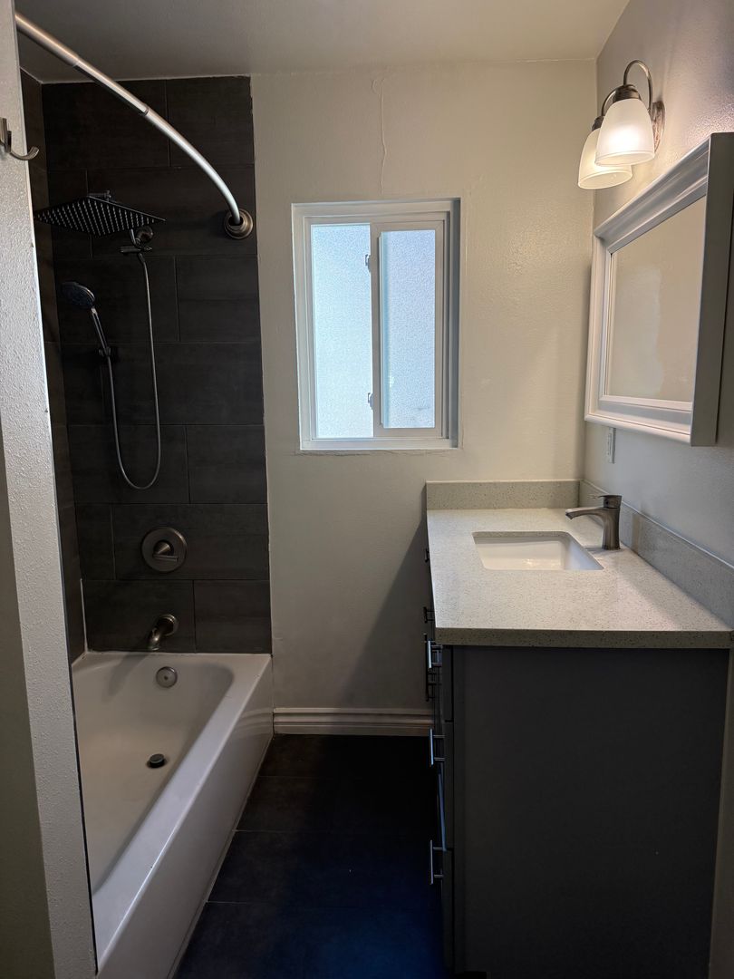 -Modern, remodeled bathroom