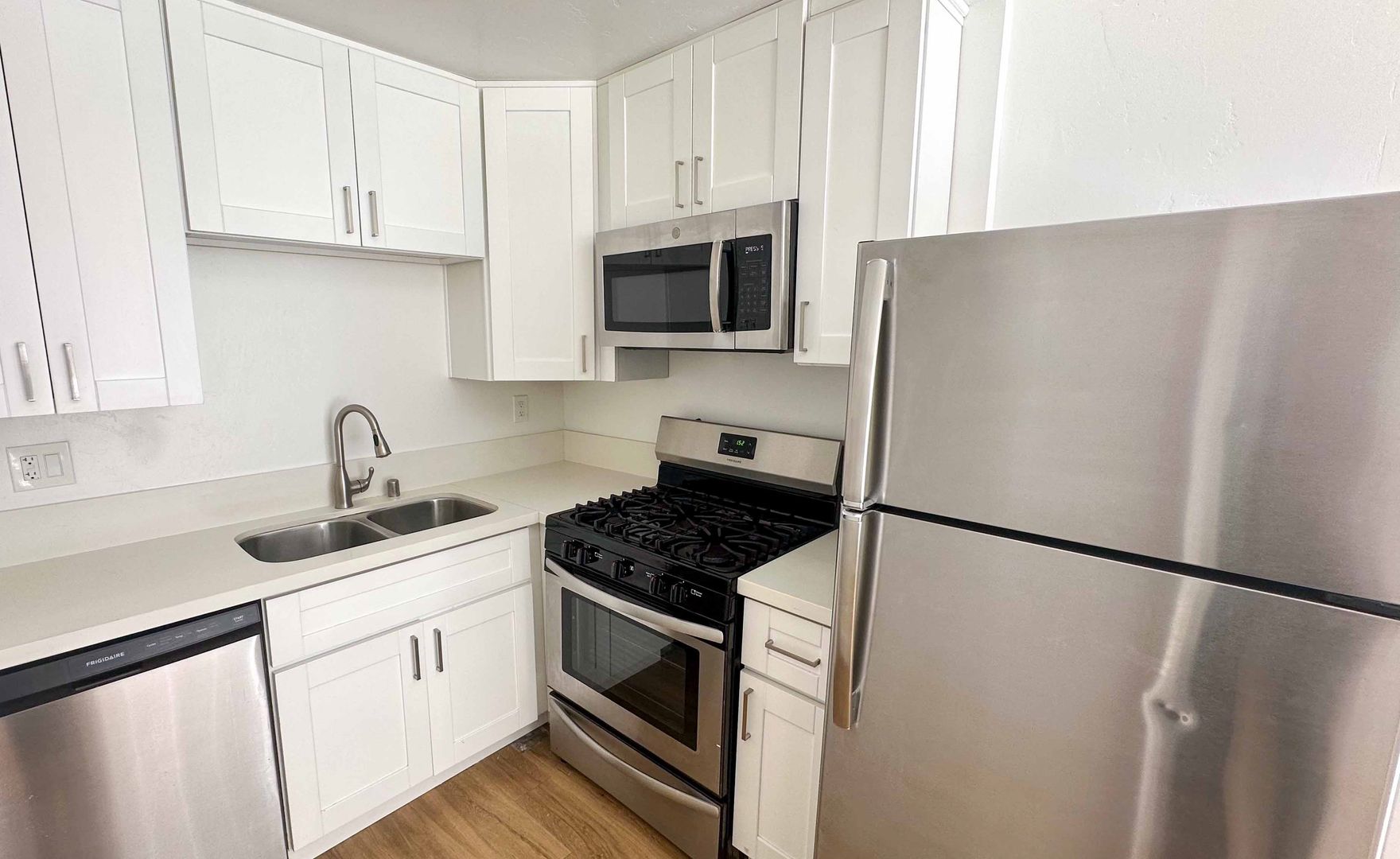 - Stainless steel appliances including gas range, refrigerator, built-in microwave, and dishwasher