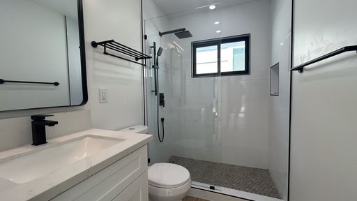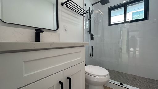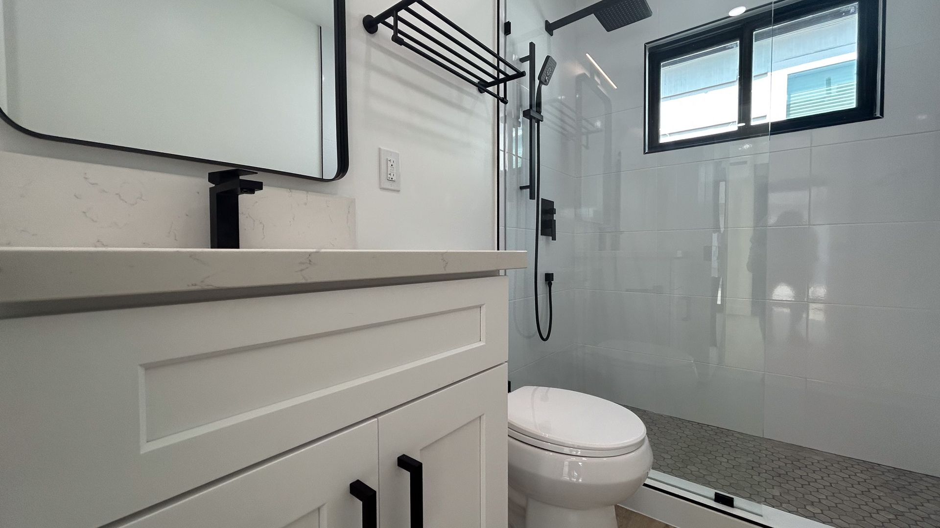 ➣Stylish bathroom with black hardware and finishes that match the kitchen’s elegance
