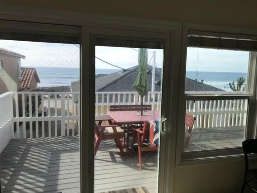 Ocean front at the Strand. Sleep to the sound of the waves. Enjoy a stroll along the beach with pedestrian walkways just steps away. This upstairs 1-bedroom apartment features sliding doors opening onto a large panoramic ocean view deck with a beautiful view to the pier. A private back patio with shaded canopy provides an additional space to relax. Porcelain tile flooring throughout. Gas Range, microwave, dishwasher, refrigerator, quiet cool whole house fan. Full length closet with custom shelving. On site laundry and assigned parking.