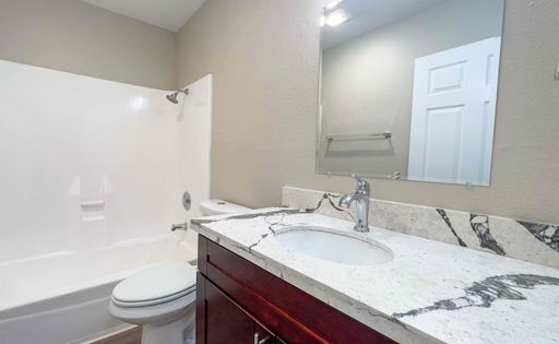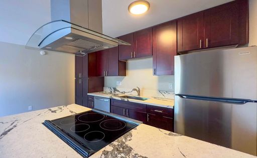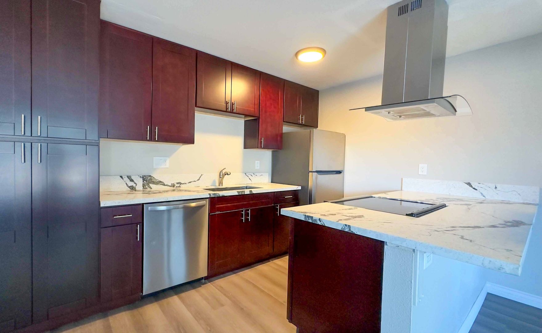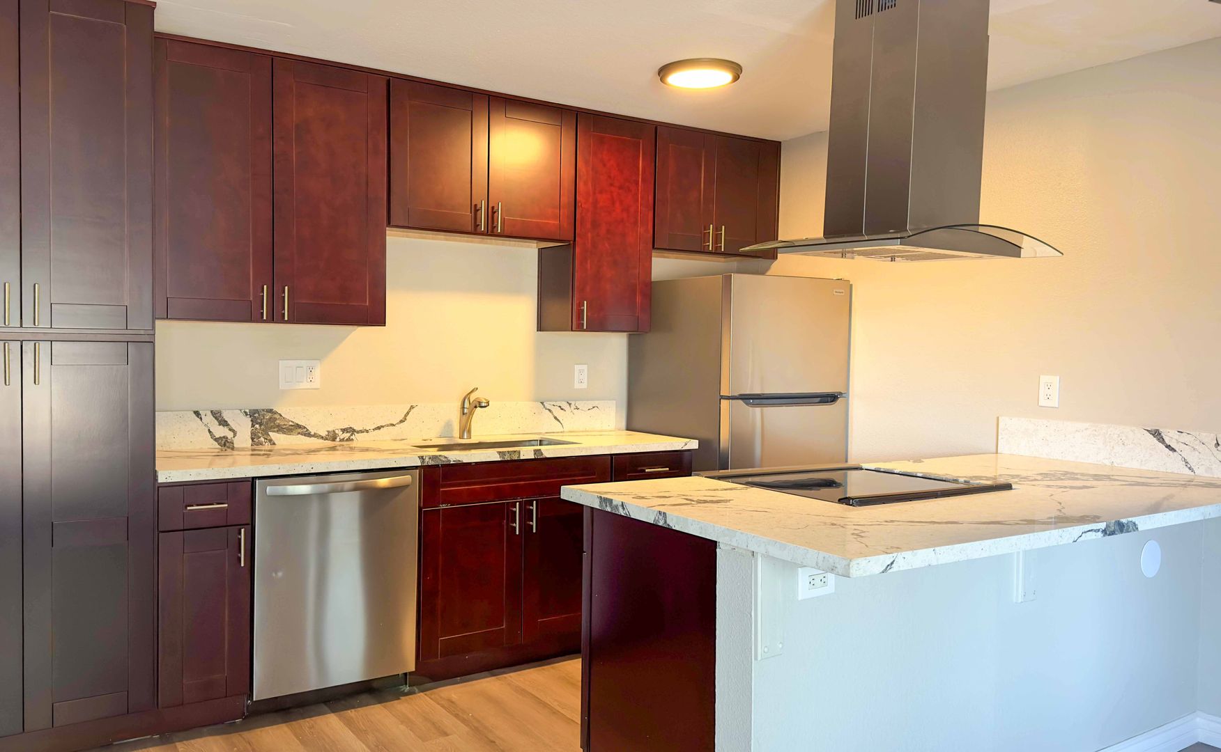 - Marble countertops and custom espresso-look cabinetry