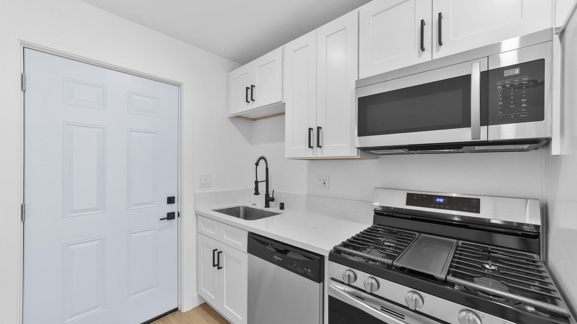 - A state-of-the-art kitchen featuring stainless steel appliances, including a gas range, built-in microwave, refrigerator, and dishwasher