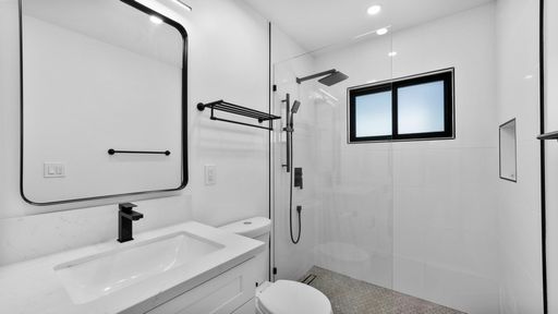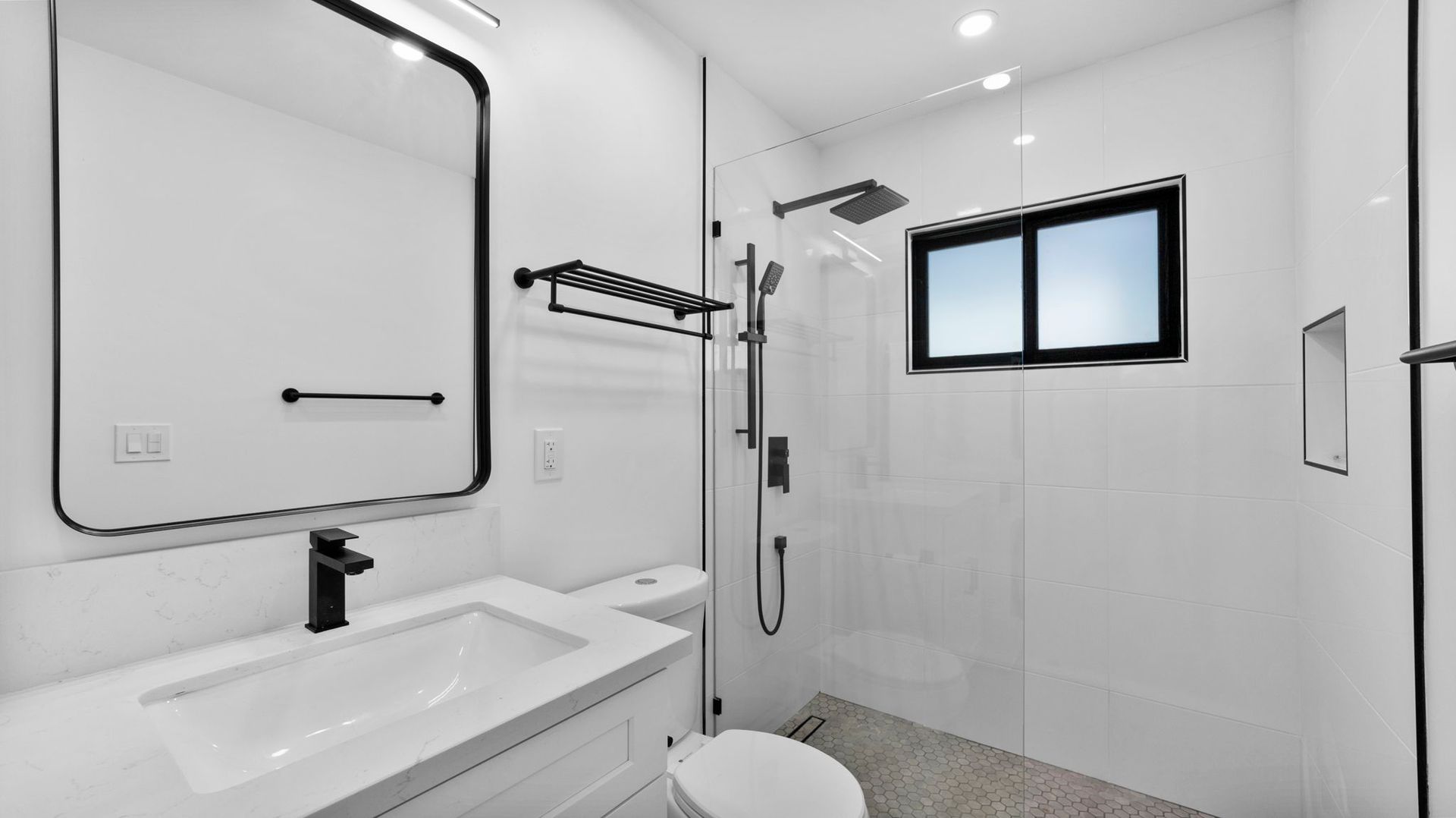 - Stylish bathroom with black hardware and finishes that match the kitchen’s elegance